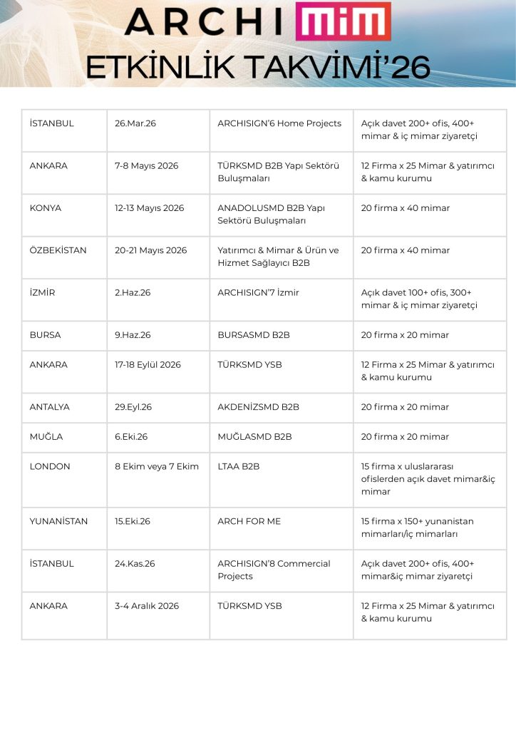 “TürkSMD 30. Yapı Sektörü Buluşmaları” etkinliğini, 05-06 Şubat tarihlerinde @tsmd_mm ‘nde gerçekleştirdik. ARCHIMIMhttps://archimim.com Paylaş FacebookTwitterPinterestWhatsApp ARCHIMIM 2026 Mimari Etkinlik Takvimi hazır… 1073 02/10/2025 Önceki İçerikNOBILI Mimarlar Buluşması – SwissotelSonraki İçerikLODA Mobilya Mimarlar Buluşması – HOM LODA Showroom