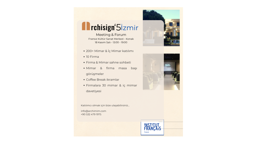 Mimarlar/iç mimarlar & ürün ve hizmet sağlayan firmalar, İzmir Fransız Kültür ve Sanat Merkezi’nde, “ARCHISIGN İzmir” iç mimari etkinliğimizde bir araya geliyor!